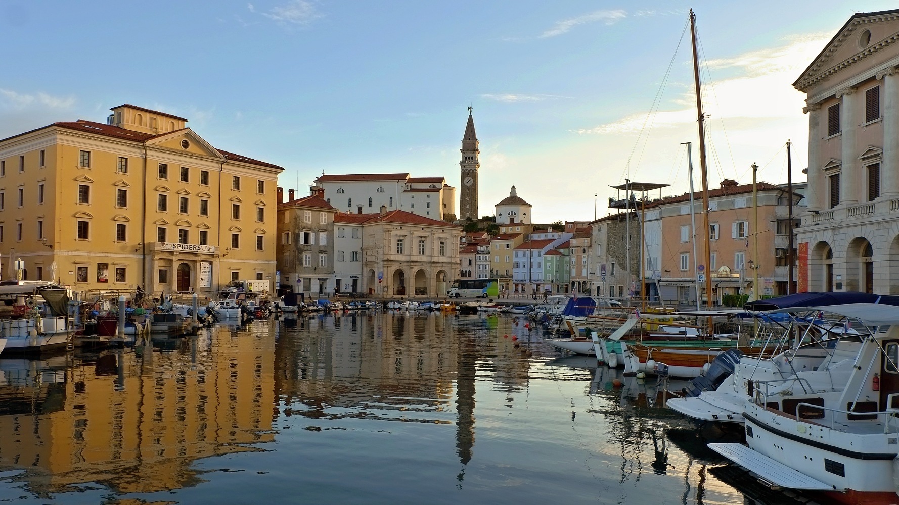 obrázok z prechádzky po mestečku Piran z roku 2023. Pohľad na prístav, Palác Trevisini, kostol Svätého Juraja, zvonicu, ktorá je replikou kampanily z Benátok a krstiteľnicu Svátého Jána Krstiteľa