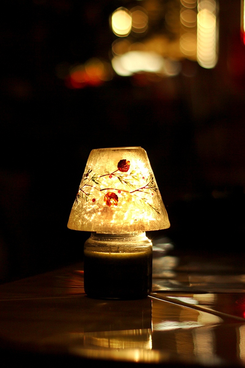 cylinder ozdobnej sviečky rozsvietilo svetlo, ktoré sa predralo cez zatiahnuté žalúzie