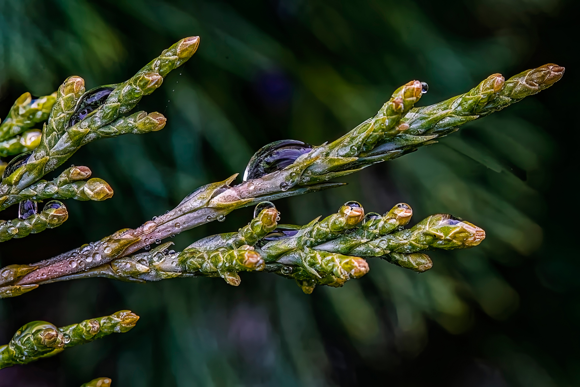 Málokto by uveril, že na ihličí tuje zostane po daždi také veľké množstvo kvapiek a v takej širokej škále veľkostí - od veľkých, viditeľných voľným okom až po super mini, viditeľných lupou s poriadnym zväčšením. Keď si fotku zväčšíte, tak niektoré mini kvapôčky aj uvidíte. Nuž matka Príroda je veľká čarodejka ...