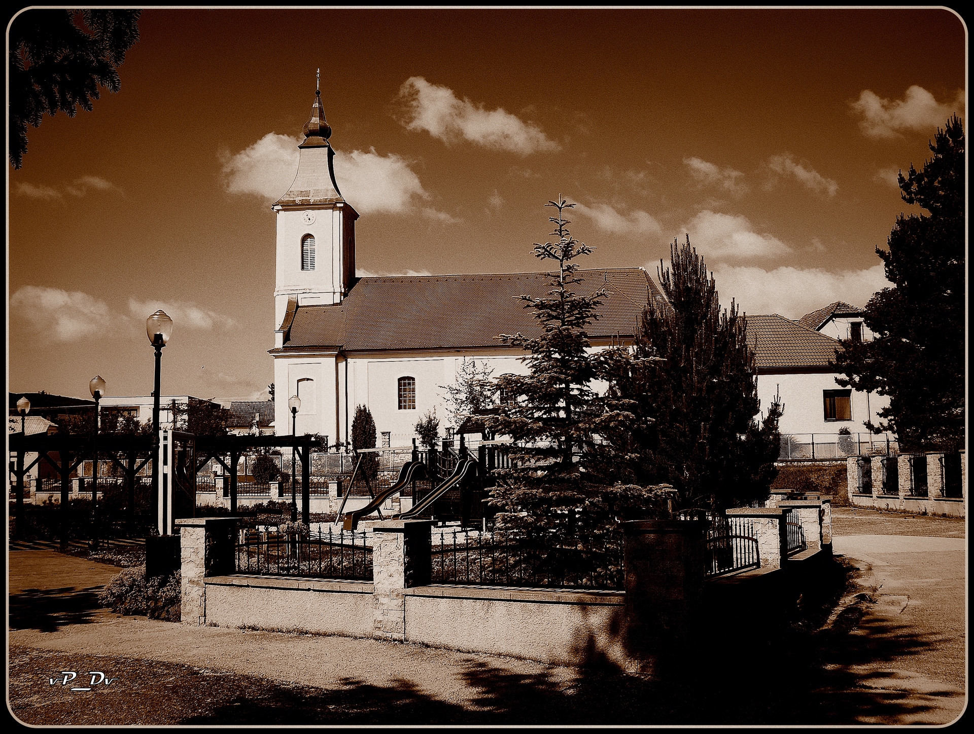 Rímskokatolícky farský kostol Narodenia Panny Márie z roku 1820. Pohľad z miestneho parku. /úprava/