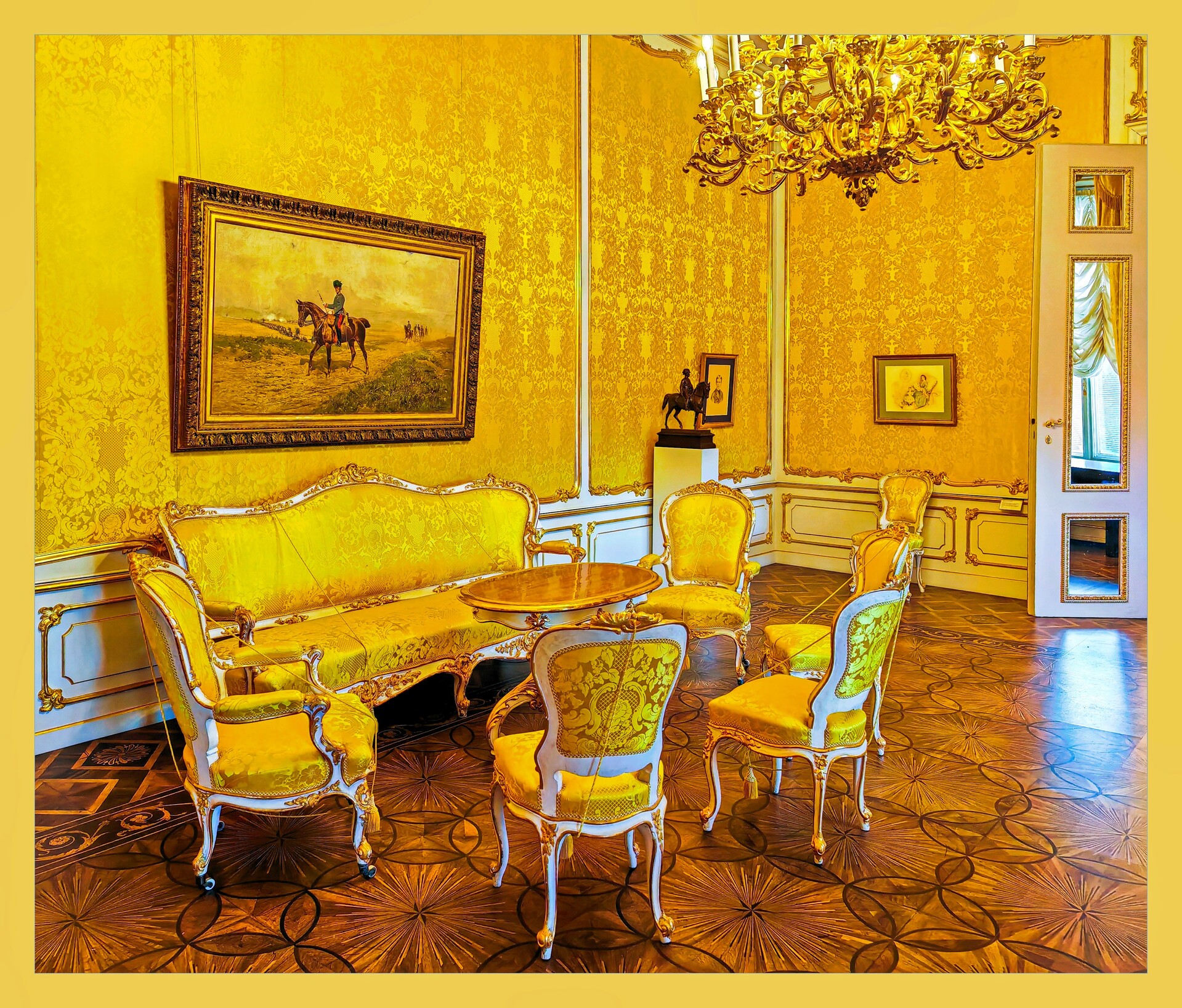 Rokoková sála s krásnymi tapetami, nábytkom, intarziami a kvetinovými parketami