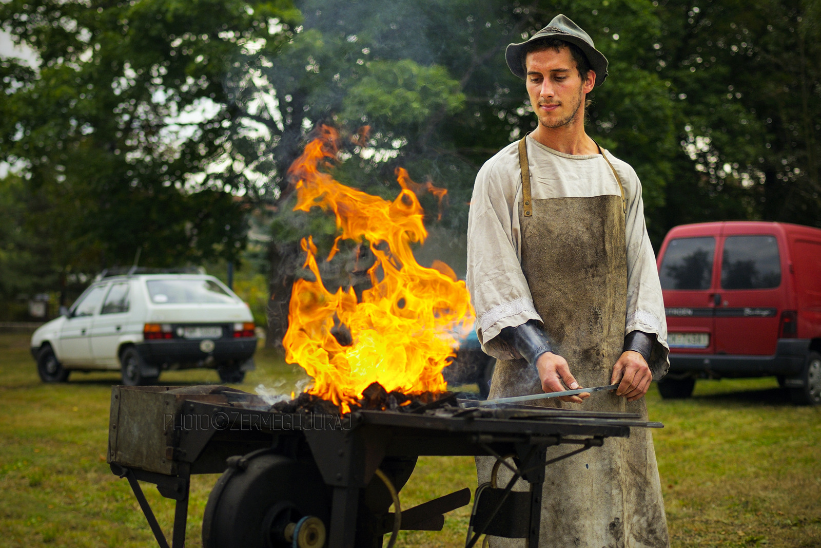 Fotografia, ktorá vznikla cca pred 15 rokmi, na zákazkovom fotení - štvordňovom maratóne medzinárodného folklórneho festivalu. Súčasťou tohto festivalu bol aj jarmok a mne sa pri snahe urobiť nejaké fotografie aj odtiaľ, podarilo odfotiť v totálnom chaose (jarmoku) tohto pána, ktorý patril do skupiny, predvádzajúcej historické remeslá...